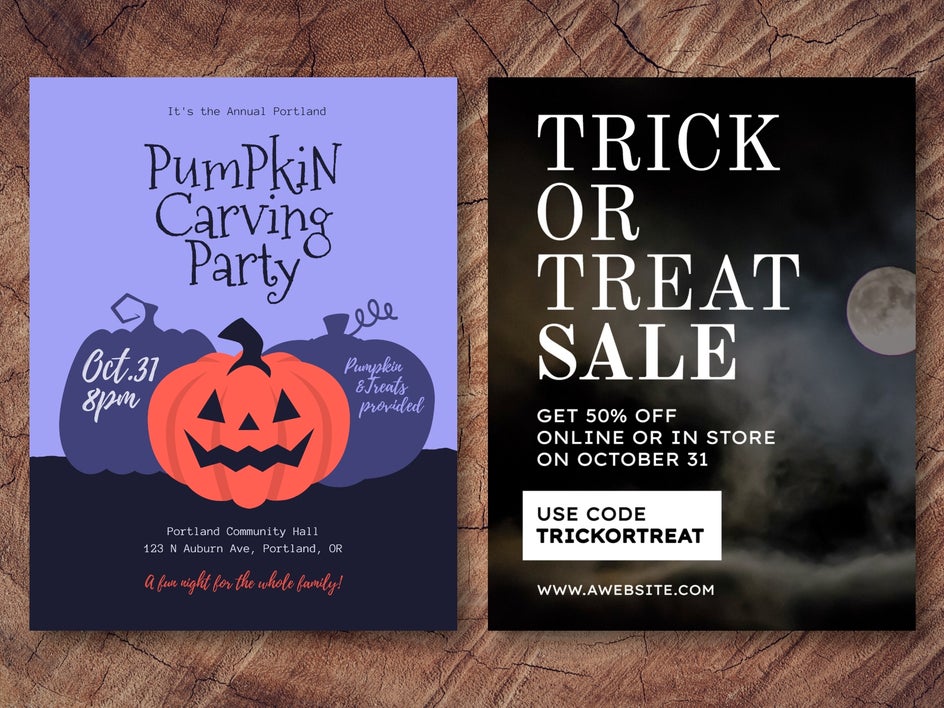The two examples below use an Instagram Story template ("Trick or Treat Sale") and a Halloween party invite ("Pumpkin Carving Party"), yet have been resized to become the perfect Halloween flyer.