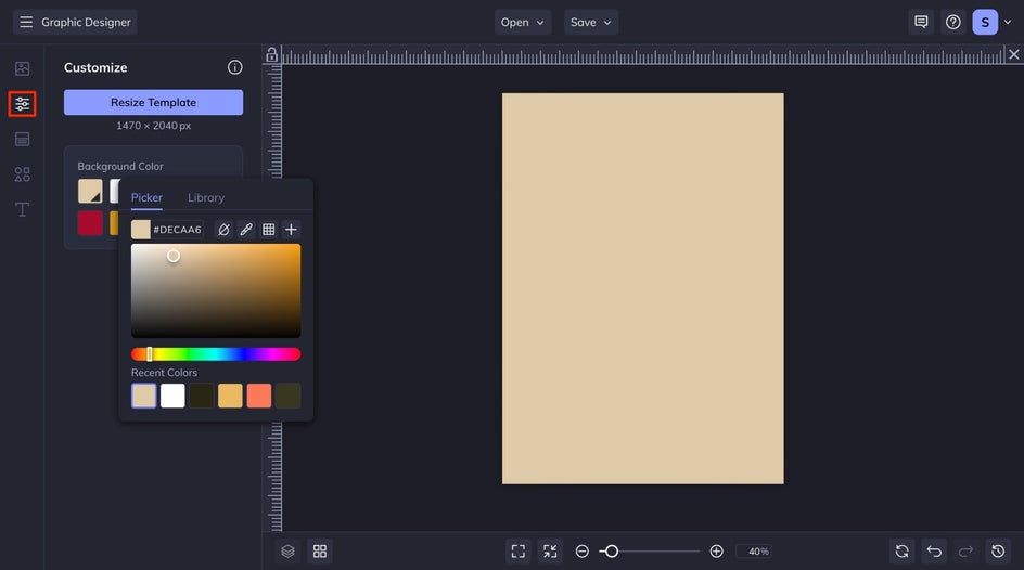 To get started on your Kindle insert, open the Graphic Designer and select Create a Blank Canvas. From here, you’ll need to enter custom dimensions to ensure your design fits perfectly between your Kindle and its case. If you have a Kindle Paperwhite (11th Gen, 4.9" x 6.8"), set your canvas size to 1470 x 2040 pixels. If you have a Kindle Basic (4.3" x 6.2"), set your canvas to 1290 x 1860 pixels.