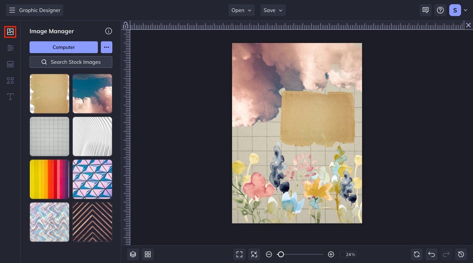 Choosing a patterned background adds depth to your design and creates a visually interesting foundation to build upon. Once you’ve selected a pattern you love, return to your image manager and add it to your design by dragging and dropping it into your canvas. You can adjust its placement, the opacity of the image, and several other edits in the Image Properties menu.