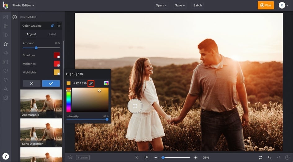 If you want to assign a color to the Shadows, Highlights, or Midtones that’s already within your photo, you can use the Eyedropper tool for easy color selection. Just select the Eyedropper tool in the color menu, drag your cursor over your photo until you find the hue you love, and click.