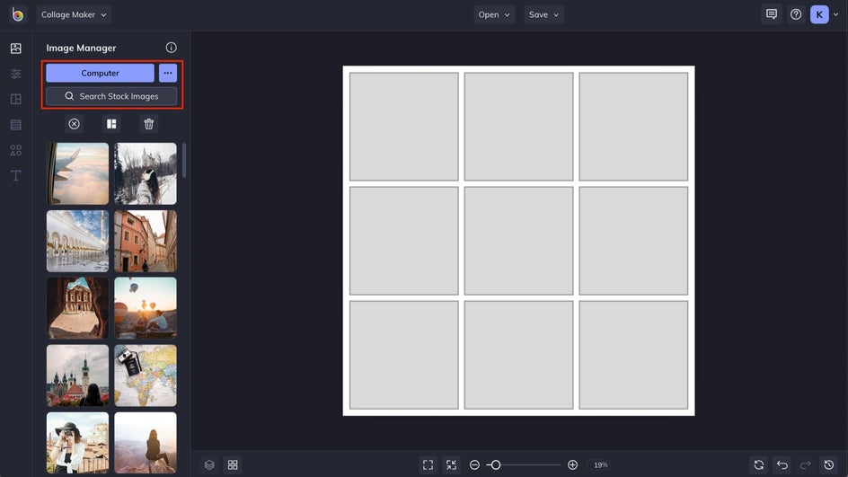 To get your images into BeFunky, start in the Image Manager. Here you can either upload files directly from your computer by clicking the blue Computer button or use the Search Stock Images to find images that inspire you. You can also click the three dots to find images saved to BeFunky, Facebook, or Google Photos.