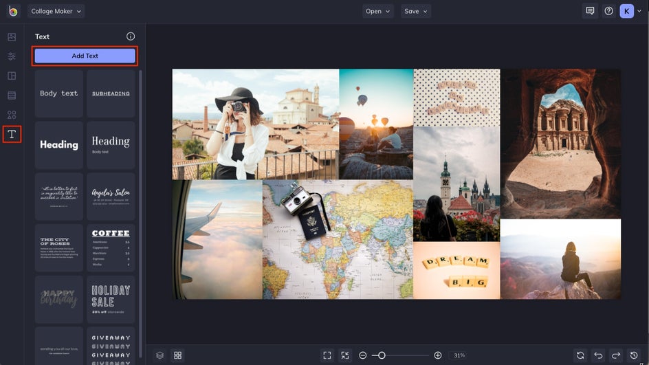 To truly customize your vision board, add text to it! Add an inspiring quote or a goal you’re looking to manifest in your board. Start by going to the Text menu, then click on Add Text or choose one of the pre-set text options.