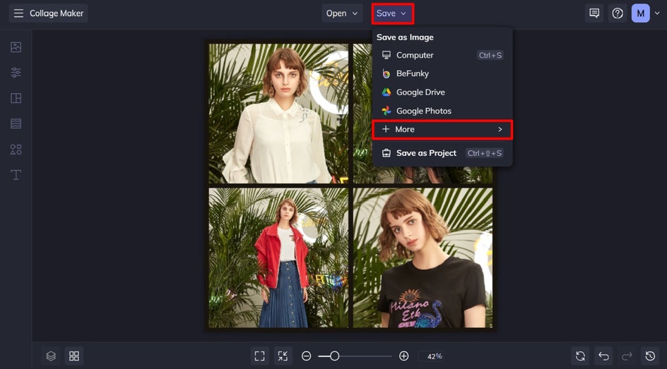 Once you’re happy with your collage design, it’s time to save it. Click Save at the top of the screen, then select your desired save location. You can also share your collage directly to your chosen social media account by clicking Save > More. You can also download it to your phone or desktop for later.