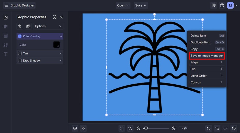 Select the graphic you wish to edit, right-click, and select Save to Image Manager from the drop-down menu. This converts your graphic into an image.