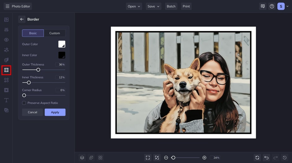 Give your image a true comic book feel by adding a border. Start by selecting the Frames tab and choosing the Border effect. For this example, we added a black inner border to make our image pop against the white. You can adjust the thickness to match the look you want for your comic panel.