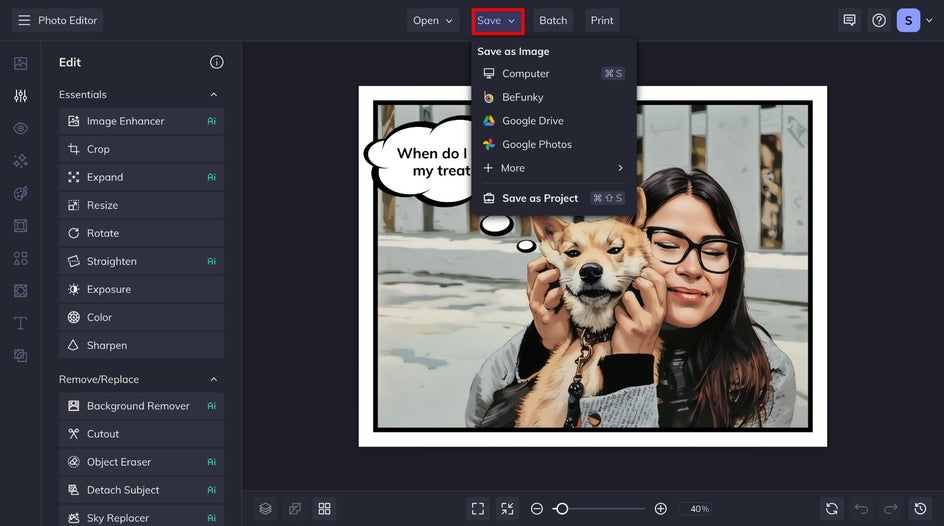 After perfecting your comic, it’s time to save your work. Click Save at the top of the canvas, followed by your preferred save location and file type.