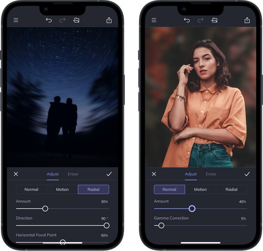 Download the mobile app to create depth, an abstract effect, or put the focus on your subject with a targeted blur.