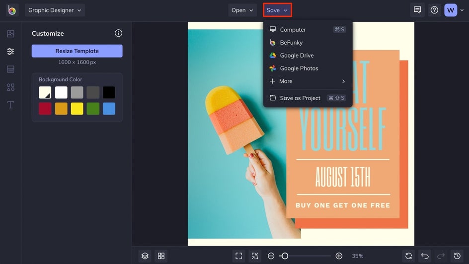 Feel free to play around with the different Drop Shadow menu options and customize your design template until it looks just right. When you’re finished, click the Save button at the top of the page. You’ll be presented with several options for saving your design – to your computer, BeFunky account, social media feed, as a project to continue editing later, and more.