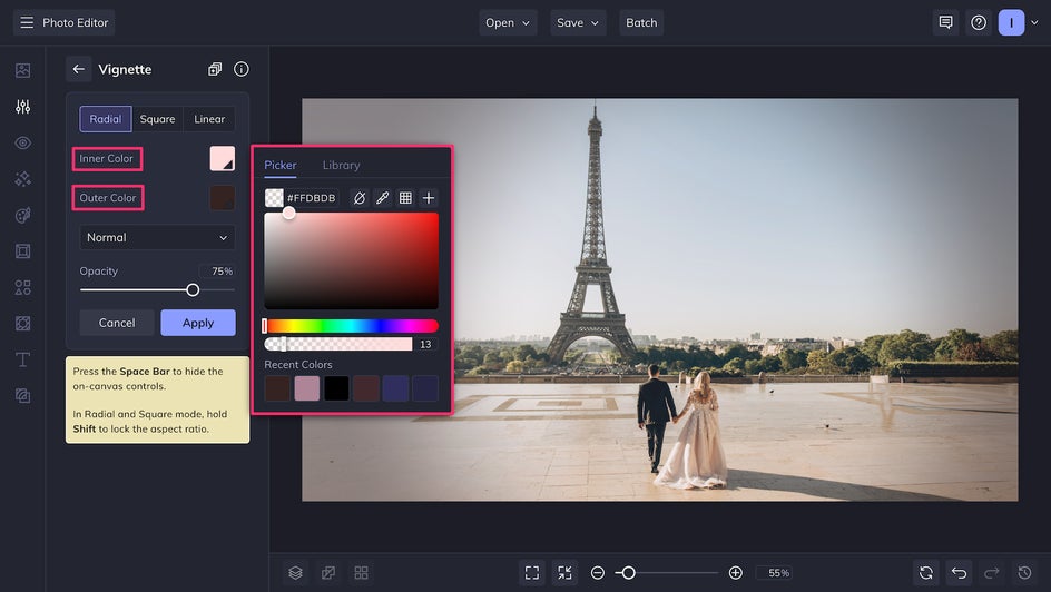 For your final step, adjust the Opacity for further control over the intensity of your vignette, and then choose a Color. When you’re satisfied with the results, click Apply.