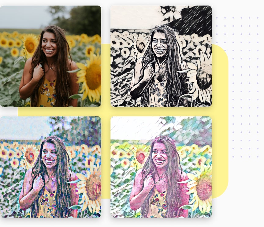 Justo cuando pensaba que ya no podía ser mejor, nos sacamos un as de la manga. Verá, nuestro Editor de fotos también incluye efectos artísticos exclusivos que convierten sus fotos en impresionantes obras de arte en toneladas de estilos diferentes, ¡todo con un solo clic! Estos efectos de Foto a arte no están disponibles en ningún otro lugar e incluyen de todo, desde el famoso Caricaturizador y efectos pictóricos como Acuarela y Pintura al óleo, hasta Arte digital, Bocetos a lápiz o tinta, ¡y mucho más! Lo mejor de todo es que nuestro equipo de desarrolladores crea cada efecto Artístico para que combinen perfectamente con sus fotos, de modo que detectan automáticamente los objetivos, las líneas, las luces y las sombras de las imágenes para transformar perfectamente toda la foto y convertirla en una obra de arte. ¡Ese es el poder de la edición de fotografías con IA! No es necesario realizar ningún trabajo adicional por su parte. De hecho, no necesita siquiera de ninguna habilidad artística para darle vida a estos efectos, ya que nuestros efectos artísticos harán todo el trabajo por usted con un solo clic.