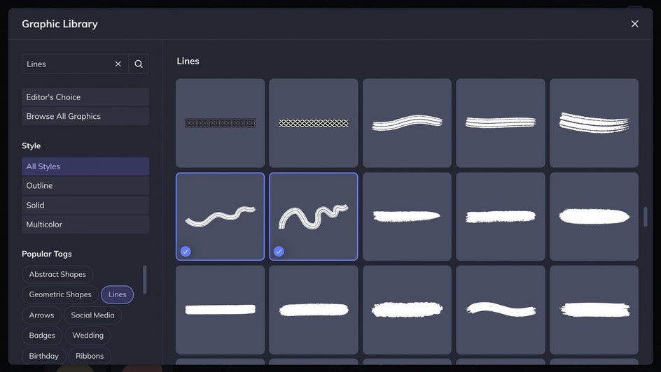 In the Graphic Library, simply type in a search term to find the related graphics you’re looking for, click on the Popular Tags, or use the filtering options to narrow things down. Click on any graphics you love to add them to your canvas before pressing the x in the upper right corner to close out of the library.