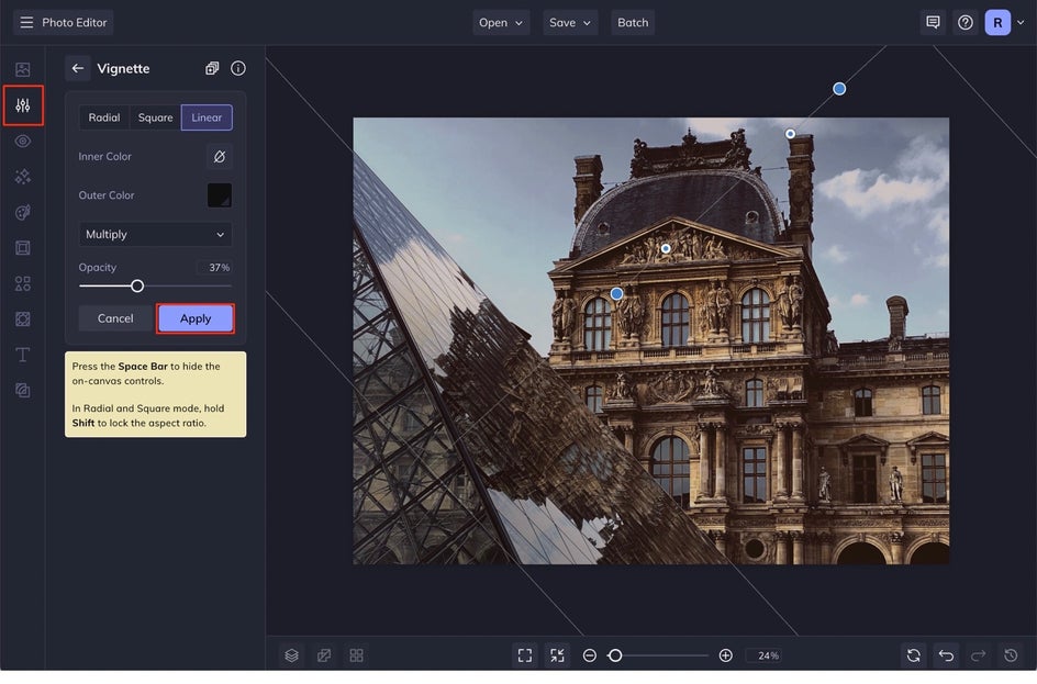 To use one, click on Vignette in the Edit menu and select either the Radial, Square, or Linear tab. Most vignettes are circular in nature, but you can get creative with the Square or Linear vignettes if you want! Drag and resize the vignette target on your image so that the focal point is in the center, then adjust the Opacity, Color, or Blend Mode from the menu.