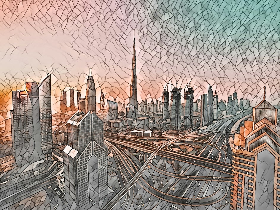 Use mosaic effects on cityscapes to capture the vibrant energy of urban life, with dynamic patterns that bring out the character of the city.
