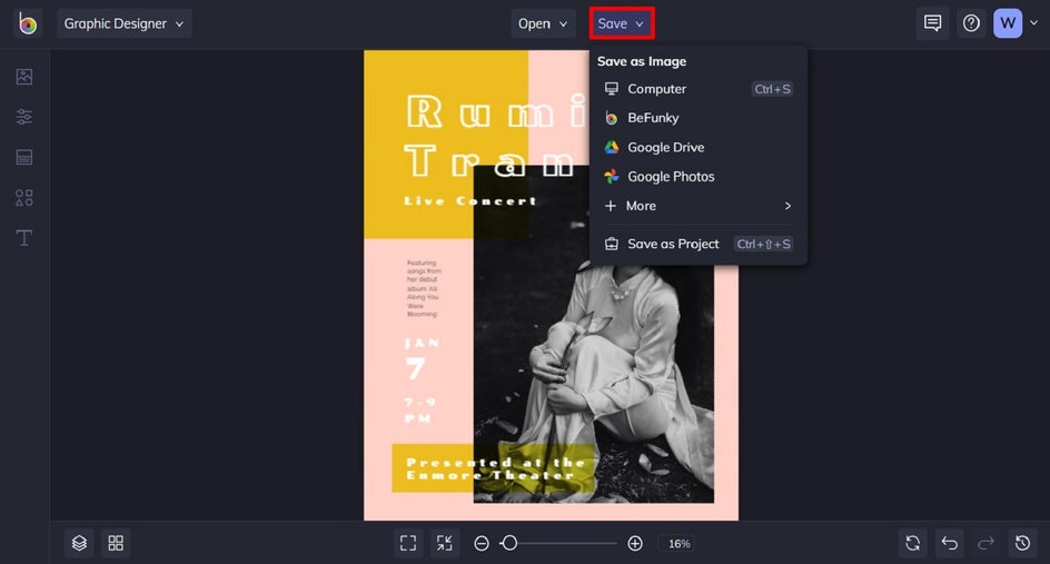 Once you’re happy with your event flyer design, it’s time to save it. Click on Save at the top of the screen, then select your desired save location. We recommend saving your flyer as a PDF file in Print quality so it’s the highest quality possible for printing. Additionally, you should consider the Save as Project feature to save your flyer as an editable file that you can adjust in the future.