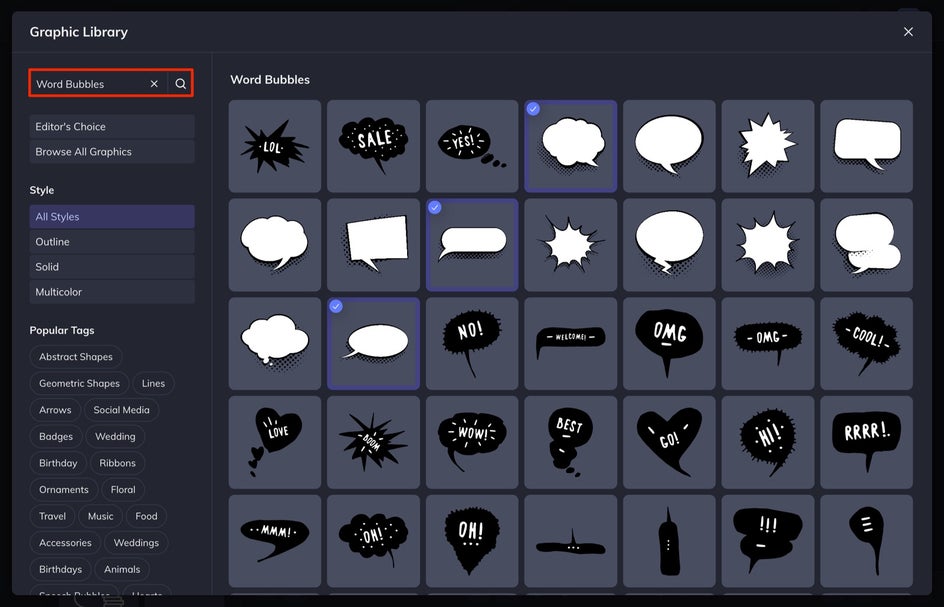 Type “Word Bubbles” in the search bar. Once you select the bubbles you want, they will automatically be added to your Graphic Library. Exit out of the library in the top right corner.