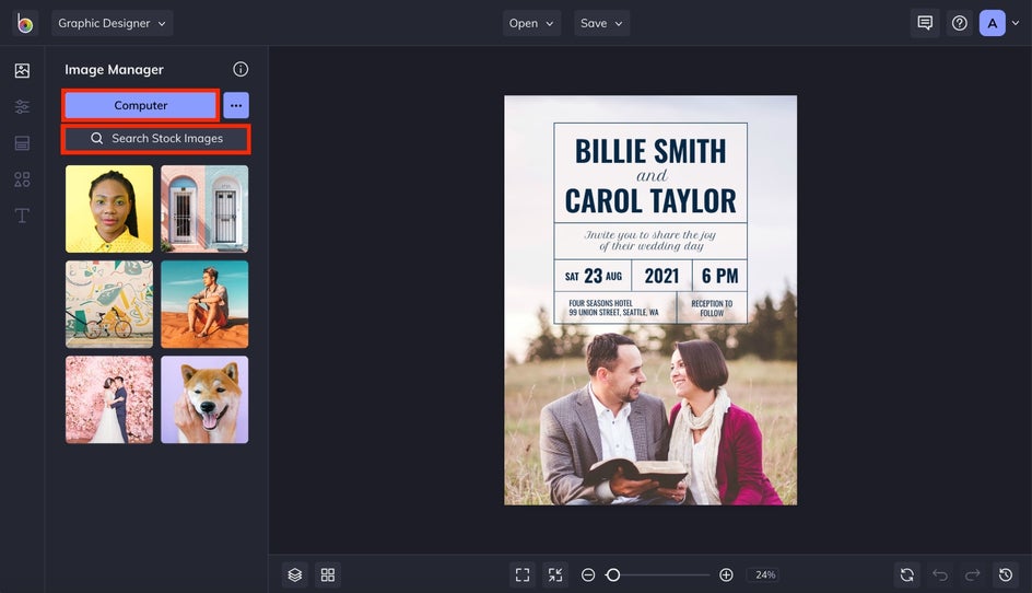 The first step when editing your wedding invitation is to incorporate your own photos or background images. Navigate to the vertical icon menu on the left side. Click on Image Manager, the topmost icon that resembles a small mountain in a picture.