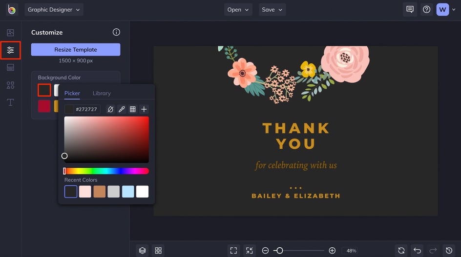 We recommend saving your Thank You Card as a PDF to keep it in high resolution if you’re planning on printing, and as a project, just in case you need to make any future changes.