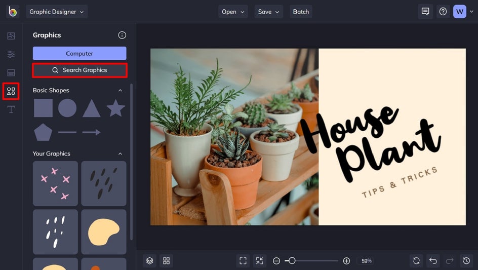 You also have the option to jazz up your YouTube Thumbnail Template with some graphics, such as shapes, symbols, lines, and more. To access BeFunky’s massive library of these, just click on Graphics in the main menu to the left, followed by Search Graphics.