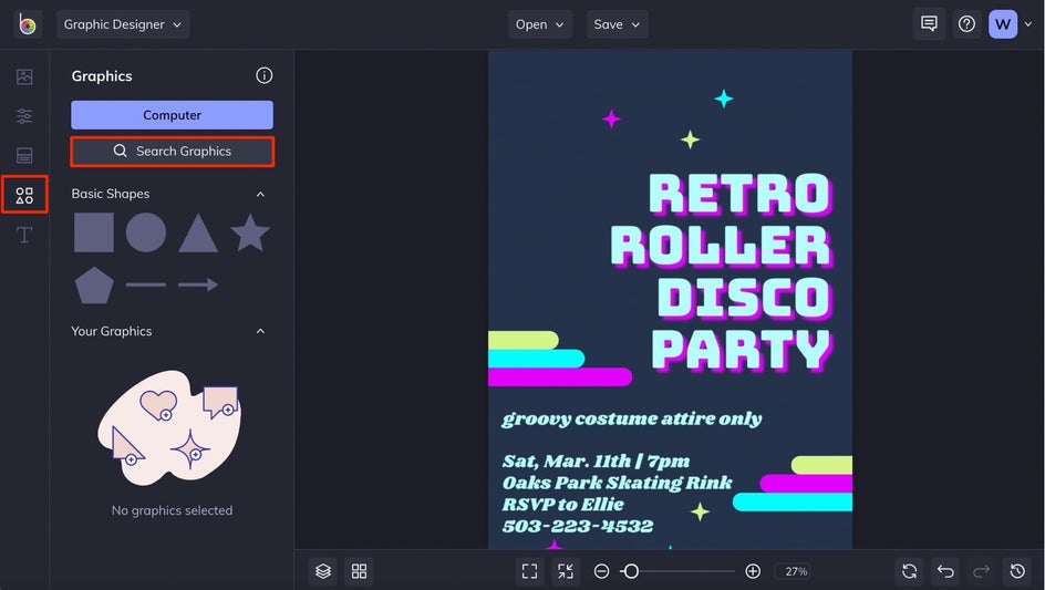 If there are graphics on your party invitation already that you want to customize, simply click on any graphic and use the Graphic Properties menu on the left to change the color, opacity, and more. We decided to keep the retro-looking graphics and change up the color scheme just a little bit.
