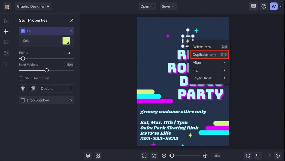 To duplicate a graphic, select it. Right-click once you have it selected to open a dropdown menu where you can select Duplicate, then move your graphic’s clone wherever you’d like on your template by dragging it to a new position. Alternatively, you can select the graphic and press the D button on your keyboard as a shortcut.