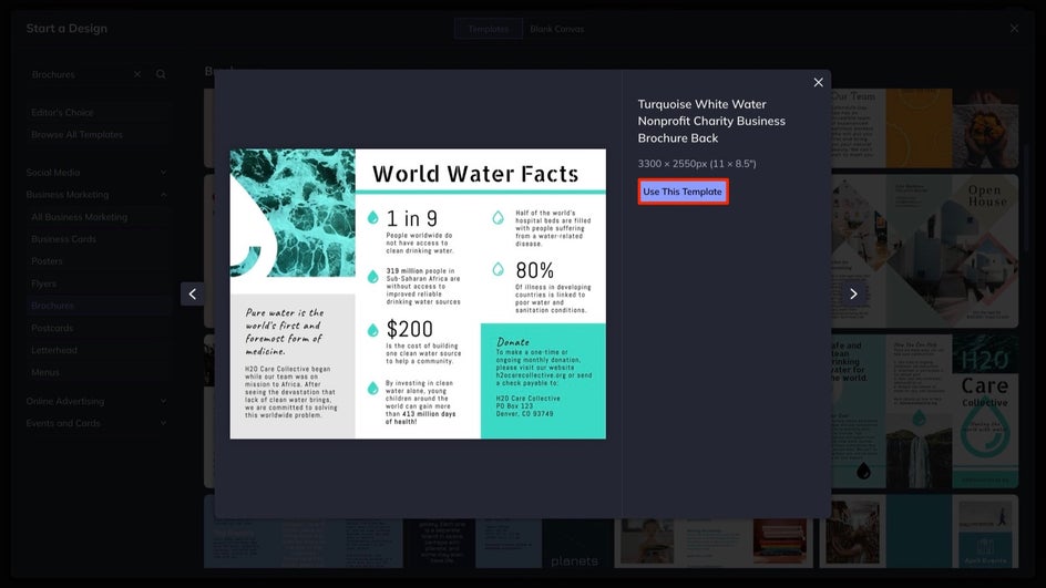 To get started, click here to head to the Brochure Maker. Find a template you like, and then click the Use This Template button to start working on it.