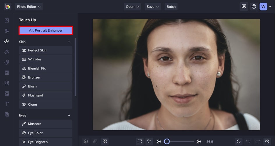 Head to BeFunky's Photo Editor and upload a photo by using the Open tab or by dragging it from your files into the interface. This is located at the top of the Touch Up menu.