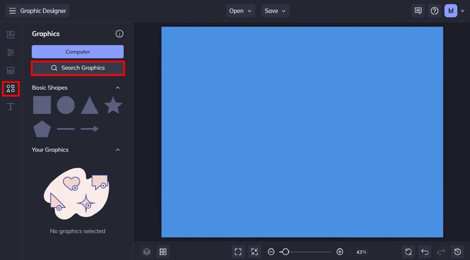 You’ll find our wide range of graphics in the Graphics tab within the main menu of the Photo Editor, Graphic Designer, or Collage Maker. Click Search Graphics to access our huge library filled with symbols, lines, illustrations, and so much more.