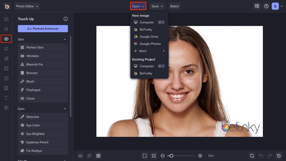 Click Here to head directly to the Touch Up tab and open your own photo using the Open tab at the top of the canvas.