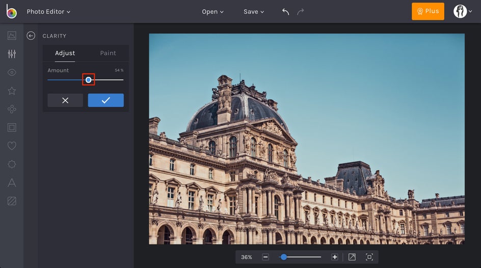 In the Edit menu on the left, select the Clarity tool and adjust the slider to enhance your photo. If you are wanting to apply Clarity in small increments, use the arrow keys on your keyboard to slide the cursor to the left or right and make micro adjustments.