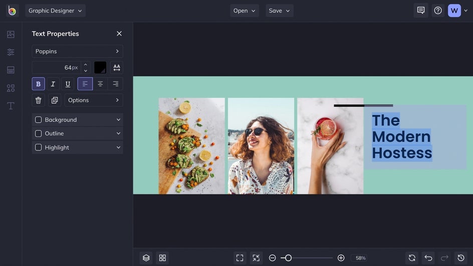 Note that any time you have an image selected on your template, you can further customize it by using the Image Properties menu that appears on the left. Add a color overlay, tint, drop shadow, and even edit the image layer using all the tools of BeFunky’s Photo Editor. You can also resize the images by dragging the blue circles around them while they’re selected.
