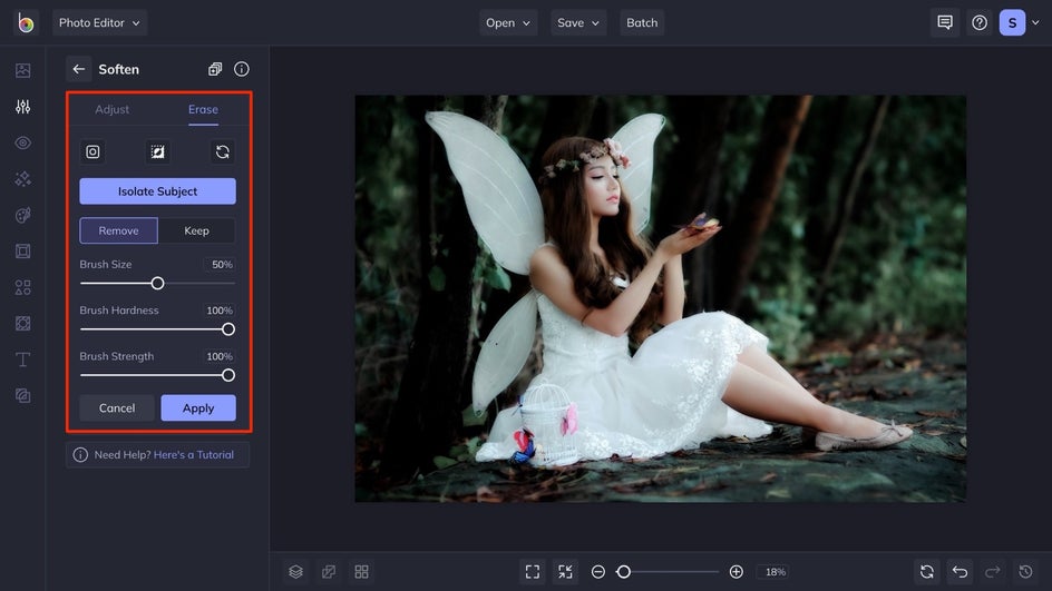 Although there is no one true definition of Fine Art Photography, it is generalized as artistic photography. Photos in this genre are usually a mix of realism and imagination, creating a sense of wonder when you look at the image. The Soften tool is best used with the partnership of Erase Mode to highlight the sense of wonder in the primary subject while keeping the background more elusive.